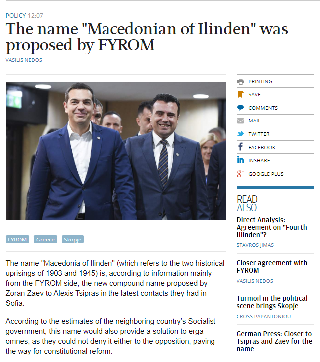 Името Илинденска Македонија (што означува два историски настана од 1903 и 1945 година), според информациите што доаѓаат од страна на ФИРОМ, му го предложил Зоран Заев на Алексис Ципрас на последната нивна средба во Софија, пишува грчкиот весник „Катимерини“.