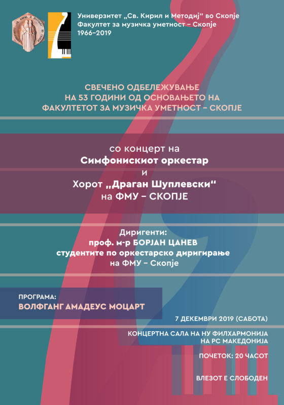 В сабота во Концертната сала на НУ Филхармонија со почеток во 20 часот ќе се одржи свечен концерт по повод 53 години од основањето на Факултетот за музичка уметност при Универзитетот „Св. Кирил и Методиј“ во Скопје.