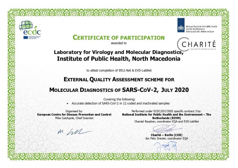 Лабораторијата за вирусологија при Институтот за јавно здравје го помина со максимален успех надворешниот тест на компетентност за детекција на САРС-Ков-2, спроведен од Европскиот центар за контрола и превенција на болести (ЕЦДЦ). Ова е исклучително значајно признание со кое се потврдуваат заложбите на здравствениот систем за справување со Ковид-19, соопшти Министерството за здравство.