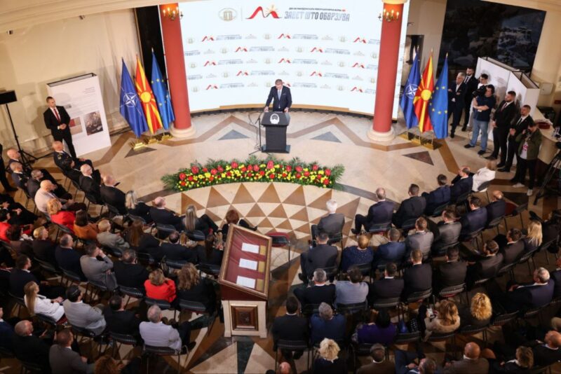 Македонската слобода, вели премиерот, не била подарена на тацна, туку напротив, македонската приказна е испишана со крв, солзи и непокор и затоа е вечна. Таа не зависи од надворешни притисоци, влијанија, постапки на одродени политичари, предавства на поединци, туку таа идеја се храни и живее во секој жив кој за неа се бори на свој начин, рече Мицикоски.