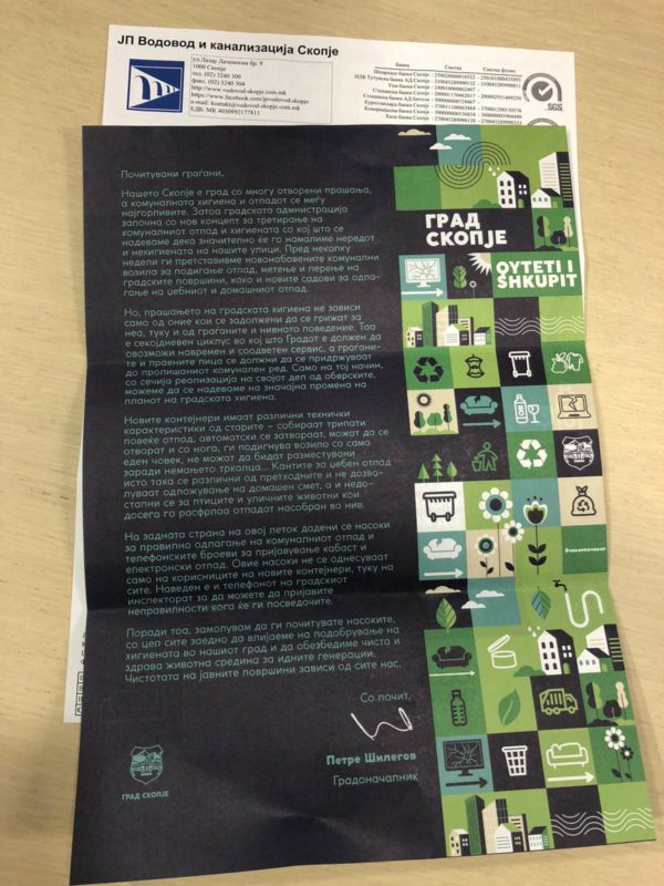 Oд денеска граѓаните на Скопје со сметките на ЈП „Водовод и канализација“ ќе добијат и леток со упатство за правилно одлагање на својот отпад. Во летокот градоначалникот Шилегов им се обраќа на своите сограѓани и им порачува дека со новиот концепт за третирање на комуналниот отпад се надева дека значително ќе се намалат нередот и нехигиената на нашите улици. Исто така, тој потсетува дека прашањето на градската хигиена не зависи само од оние што се задолжени да се грижат за неа, туку и од граѓаните и нивното поведение и само со реализација на својот дел од обврските можеме да се надеваме на поголема хигиена во градот.
