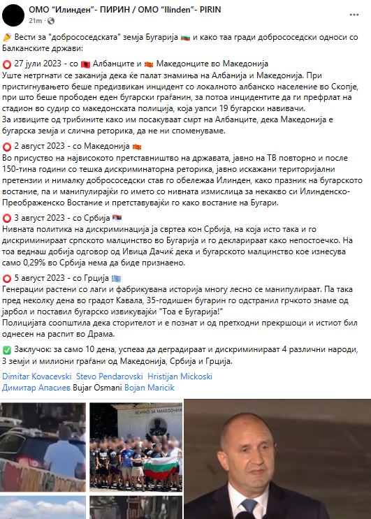 ОМО „Илинден“ – ПИРИН: За 10 дена, Бугарија успеа да деградира 4 народи, 3 земји и милиони граѓани од Македонија, Србија и од Грција