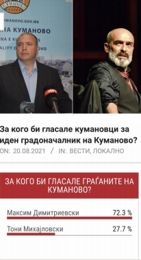 На прашањето – „За кого би гласале кумановци за иден градоначалник на Куманово“, 72,3% од испитаниците се изјасниле за Максим Димитриевски, наспроти 27,7% за Тони Михајловски.