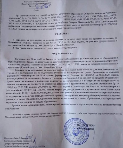 „МОН презема обврска за повторно да го преиспита целиот случај во врска со постапката за доделување парична награда за ученикот и наставникот ментор, но и постапката и начинот на кој е организиран самиот натпревар од страна на здружението на наставници, кое ја има акредитацијата за организирање на натпреварите по математика. Несомнено дека се работи за талентиран ученик, кој заедно со својот ментор вложил многу труд за постигнување на успехот на државниот натпревар на кој учествувале. Но, законската регулатива не дозволува тие да го остварат правото за кое аплицирале во МОН. Сепак, во соработка со локалната самоуправа во Штип, ученикот ќе биде поддржан со еднократна парична награда од 15 илјади денари и признание за почесен граѓанин на општината“, велат од Министерството.