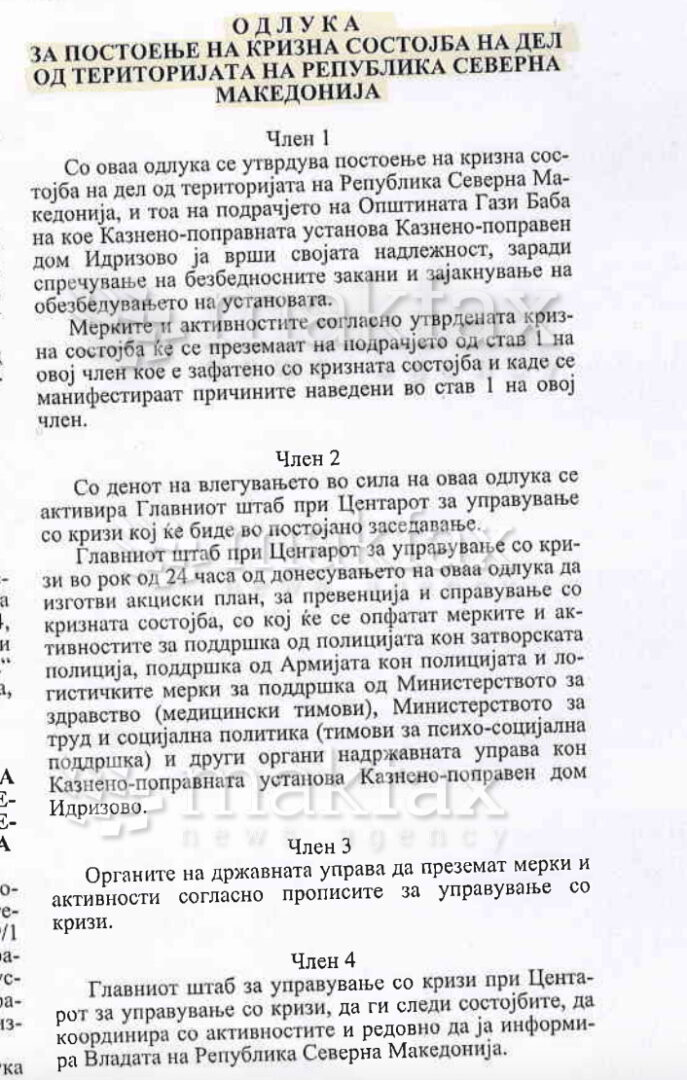 „Со оваа одлука се утврдува постоење кризна состојба на дел од територијата на Република Северна Македонија, и тоа на подрачјето на општината Гази Баба, на кое Казнено-поправната установа Казнено-поправен дом ‘Идризово’ ја врши својата надлежност поради спречување на безбедносните закани и зајакнување на обезбедувањето на установата“, гласи текстот на одлуката.
