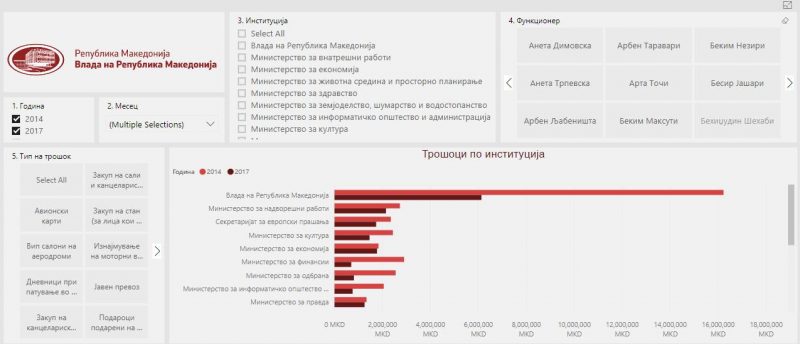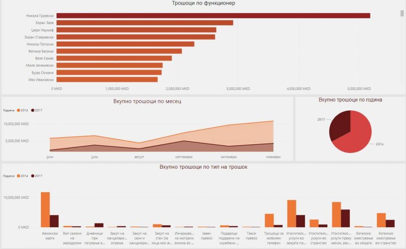 За поголема прегледност и споредбена анализа, министерот информираше дека во алатката за визуелизација се вметнати и трошењата на функционерите од претходната Влада во првите 6 месеци од преземањето на функциите по изборите, поточно за периодот јуни – ноември 2014 година, за да се утврди нивото на трошењата на функционерите на актуелната влада и да добие увид дали овие функционери трошат повеќе или помалку од функционерите од претходната влада.