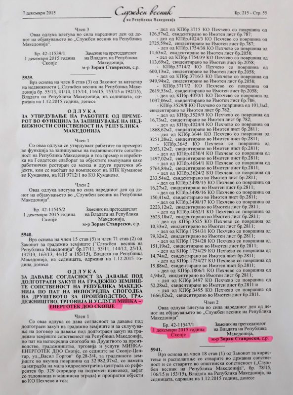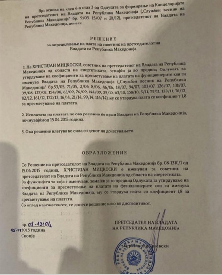 „Конзорциумот во кој удел има Христијан Хидро Мицкоски од владата на носителот на криминалот Груевски добил согласност за користење вода и закуп на земјиште за изградба на хидроцентрали. Мицкоски и конзорциумот во кој тој има удел, токму во време кога е советник на носителот на криминалот, Никола Груевски, во 2015 година, добива државно земјиште од речиси 33 илјади квадратни метри за изградба на хидроцентрала“, наведува СДСМ во соопштението со кое од партијата до медиумите испратија и решение за определување на платата на Мицкоски како советник на Груевски, како и одлука за закуп на земјиште објавена во „Службен весник“.