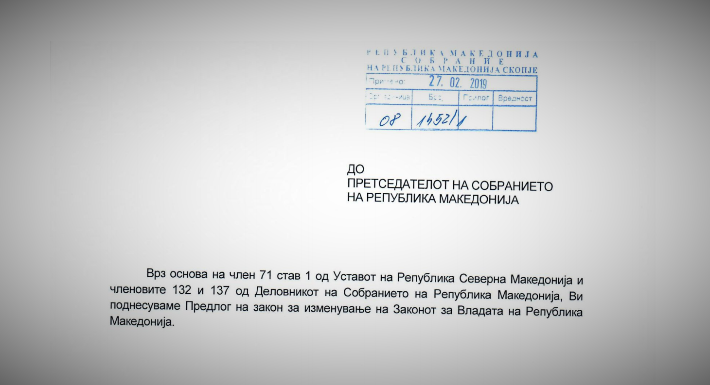 Покрај предложените измени на Законот за организација и работа на органите на државната управа, пратениците предлагаат и измени на Законот за Владата. Целта на овој предлог-закон е да се направи усогласување со Предлог-законот за изменување и дополнување на Законот за организација и работа на органите на државната управа, во кој се предвидува основање на ново министерство за политички систем и односи меѓу заедниците.