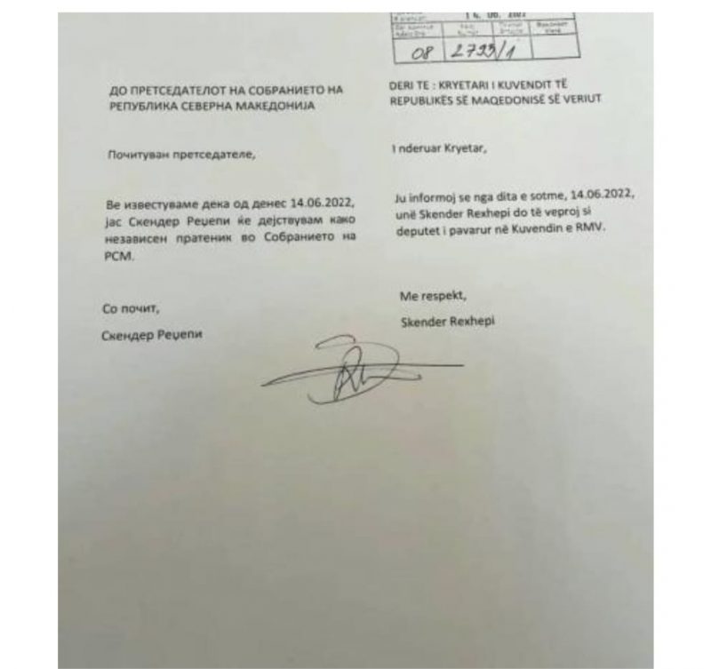 Реџепи денеска до претседателот на Собранието Талат Џафери доставил известување во кое се вели дека тој од сега натаму ќе дејствува како независен пратеник.