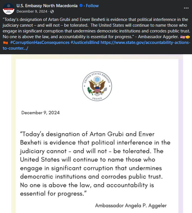 „Денешното назначување на Артан Груби и Енвер Беџети е доказ дека политичкото мешање во судството не може – и нема – да се толерира. Соединетите Американски Држави ќе продолжат да ги именуваат оние кои се вклучени во значителна корупција што ги поткопува демократските институции и ја нагризува јавната доверба. Никој не е над законот, а одговорноста е од суштинско значење за напредок“, рече тогаш американската амбасадорка, Ангела Агелер.