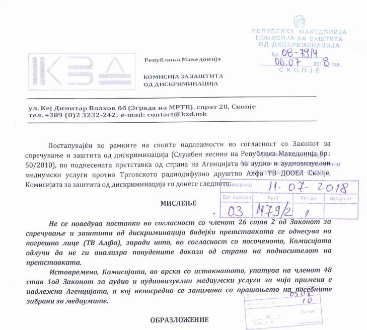 Комисијата за заштита од дискриминација одлучи да не покрене постапка против телевизијата „Алфа“ за дискриминација по етничка основа сторена во емисијата „Миленко Неделковски шоу“ емитувана на 27.1.2018 година. На одговорот е потпишан претседателот на Комисијата, Александар Даштевски, кој важи за апологет на претходната власт.