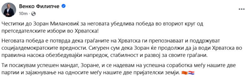 Лидерот на СДСМ, Венко Филипче упати честитка до Зоран Милановиќ за неговата убедлива победа во вториот круг од претседателските избори во Хрватска.