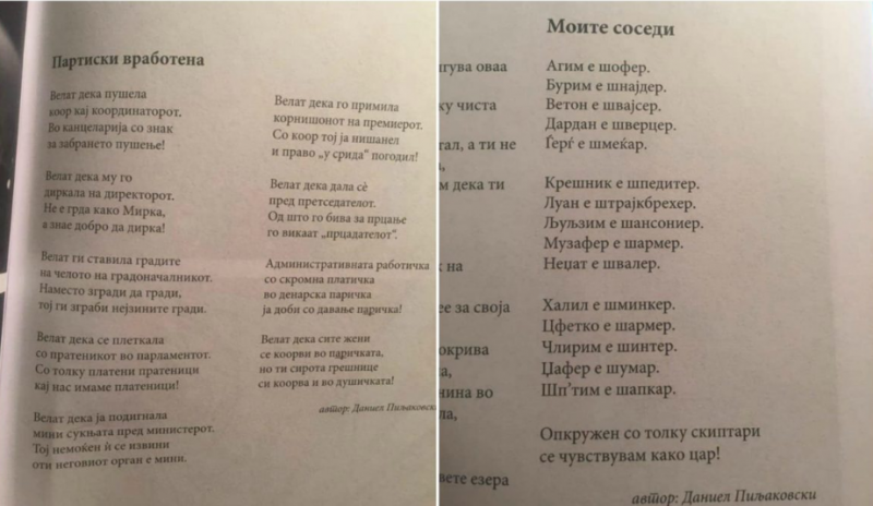 „Признавам дека јас напишав, но тоа се само песни, не се политички колумни ниту обвиненија за конкретни учесници. Тие се само опомена за моралните недостатоци во едно општество, една од најважните цели на литературата, за да биде ангажирана и да има општествена смисла“, вели Блажевски.