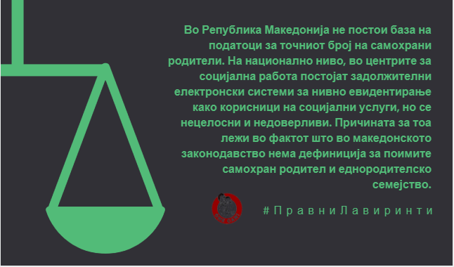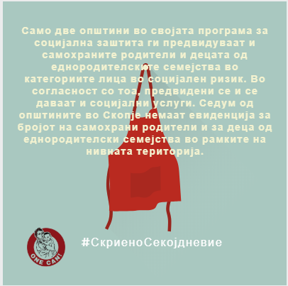 Во периодот од јуни – декември годинава се одвива проектот на „Една може!“ – единствената организација за унапредување на права за самохрани родители – „Еднакви права и можности за самохраните мајки“, кој во себе содржи истражување на #СкриеноСекојдневие, #ПравниЛавиринти и #ПраваМожности кои се однесуваат на самохраните мајки кои ќе бидат проследени во експертска анализа од правен и родов аспект.