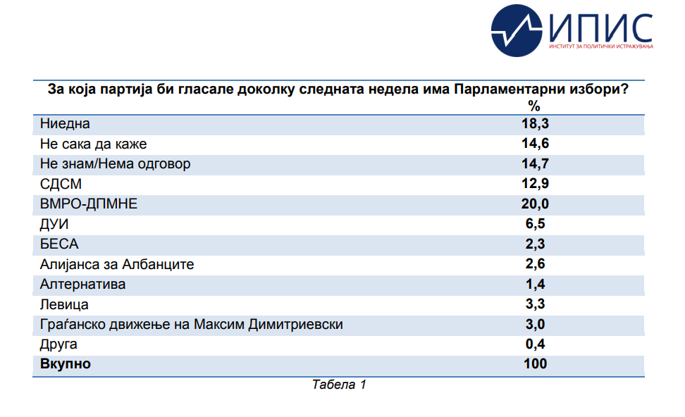 Во анкетата на Институтот за политички истражувања, на прашањето доколку следната недела има избори, 20 отсто од гласачите одговориле дека би се определиле за ВМРО-ДПМНЕ, 12,9 отсто би го поддржале СДСМ, а 6,5 отсто гласот би го дале за ДУИ.