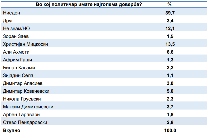 На прашањето во кој политичар имаат најголема доверба, 13,5 отсто од анкетираните се определиле за Христијан Мицкоски, 5 отсто за Димитар Ковачевски, 2,8 отсто за Стево Пендаровски,1,5 отсто за Зоран Заев, а 6,6 проценти за Али Ахмети. 1,1% е поддршката за Зијадин Села, 3% на Димитар Апасиев, 2,2 отсто во Билал Касами, 1,3 отсто на Африм Гаши, 3,7% на Максим Димитриевски, а 2,3 отсто за Никола Груевски. Голем процент од анкетираните – 39,7 отсто одговориле дека немаат доверба во ниту еден политичар, не знаеле да одговорат 12,1% отсто, а 3,4 проценти се изјасниле за друг.
