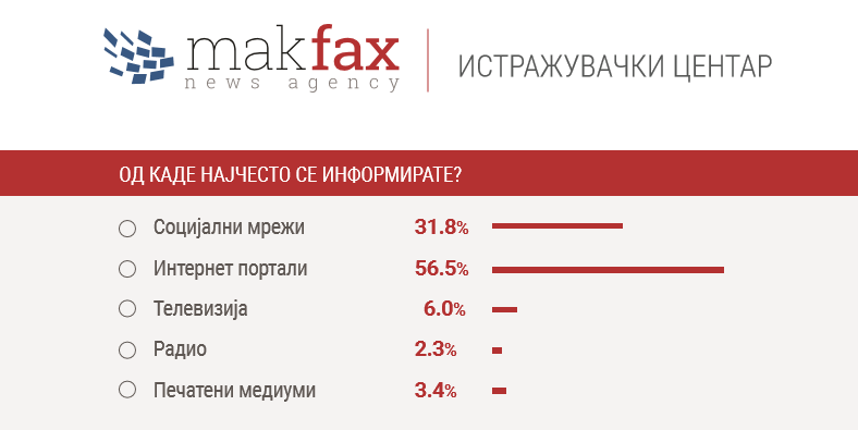 Во онлајн-анкетата што ја спроведе истражувачкиот центар на „Макфакс“, на прашањето „Од каде најчесто се информирате?“, над половина од анкетираните, 56,5 отсто, одговориле дека актуелните новости ги дознаваат од интернет-порталите.