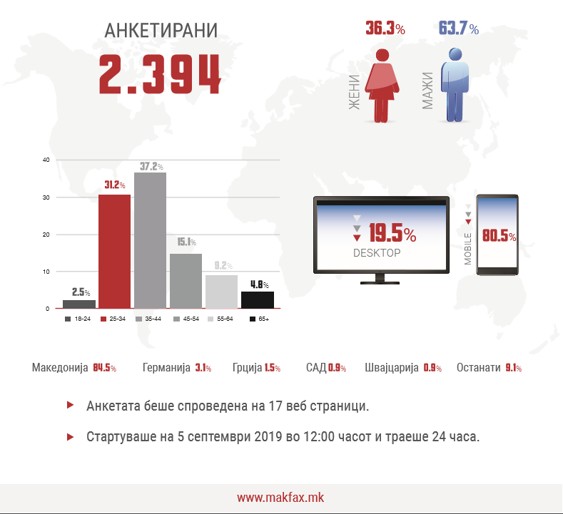 Од вкупно 2.394 анкетирани, според податоците на истражувачкиот центар на „Макфакс“, поголемиот повеќето (63,7 проценти) биле мажи. Над 80 отсто од анкетираните гласале од Македонија.