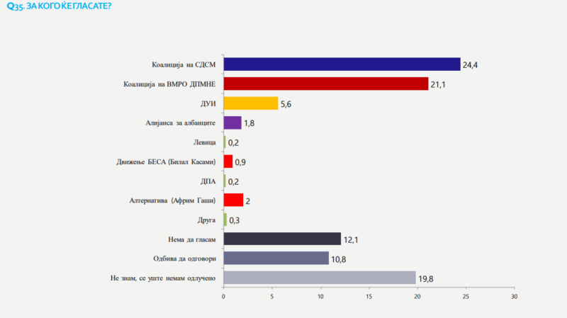 За коалицијата предводена од СДСМ би гласале 24,4 од испитаниците, додека за коалицијата предводена од ВМРО-ДПМНЕ би гласале 21,1 отсто. Вакви се резултатите од анкетата спроведена од страна на „Тим институт“, што беше реализирана за потребите на СДСМ.