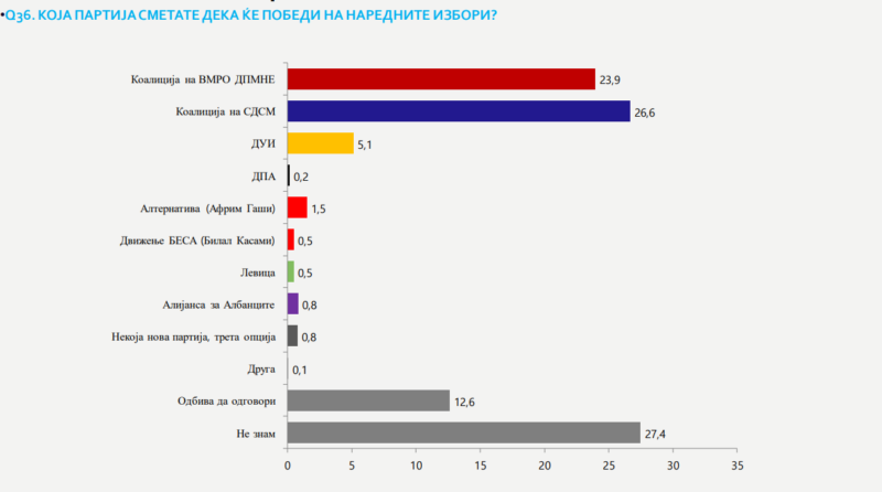 Поголем дел од испитаниците (26,6 проценти) сметаат дека Коалицијата предводена од СДСМ ќе победи на следните избори, додека 23,9 отсто веруваат дека победата ќе ја понесе опозициската ВМРО-ДПМНЕ.