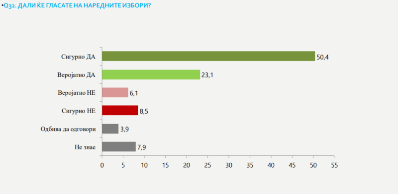 На прашањето „Дали ќе гласате на наредните избори?“ – 50,4 проценти од испитаниците одговориле дека сигурно ќе гласаат, веројатно ќе гласаат 23,1 осто, сигурно нема да гласаат 8,5 проценти од испитаниците, додека 7,9 проценти одговориле дека не знаат дали ќе го остварат своето право на глас.