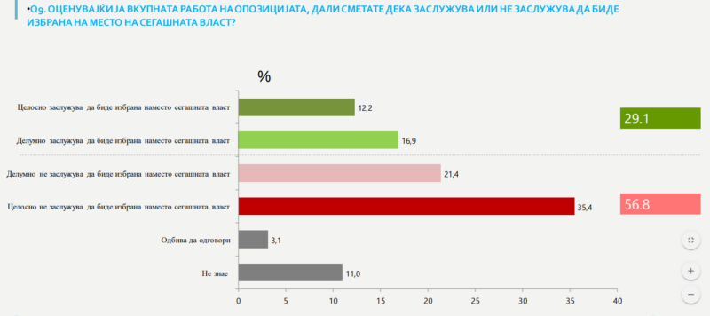 Анкетата го третира и прашањето дали опозицијата заслужува или не да биде на местото на сегашната власт, на што според резултатите 29,1 осто се изјасниле дека делумно или целосно треба да биде така, додека против се изјасниле 56,8 проценти од испитаниците.