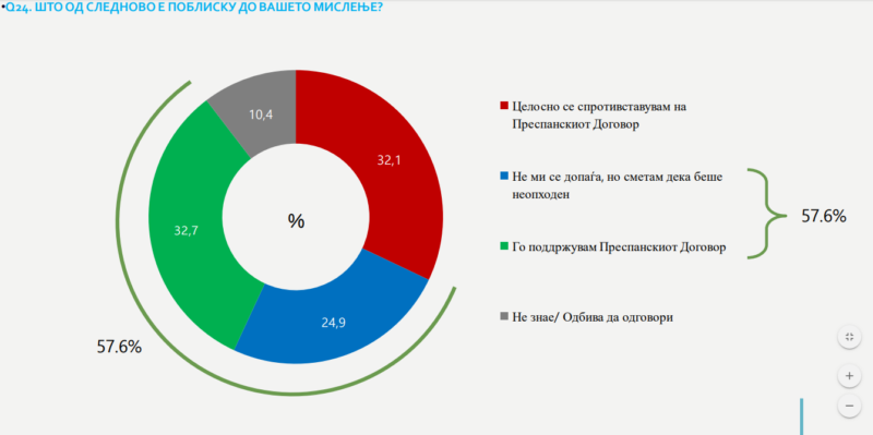 Во однос на преспанскиот договор испитаниците се со поделени ставови. 32,7 проценти се изјасниле дека го поддржуваат, додека 32,1 отсто одговориле дека целосно се спротивставуваат на преспанскиот договор. Не е мал ни процентот (24,9 проценти) на оние кои одговориле дека не им се допаѓа договорот, но сметаат дека бил неопходен.