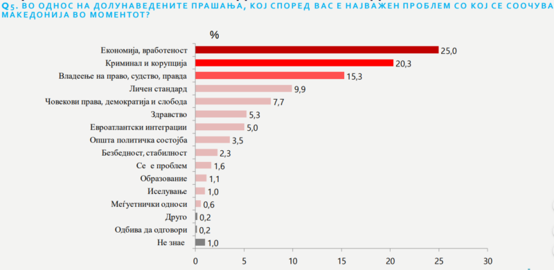 Во однос на главните приоритети, истражувањето покажа дека на граѓаните важни им се економијата, правдата, корупцијата и здравството. Одговарајќи на прашањето кој е најважниот проблем со кој Македонија се соочува во моментов, 25 проценти ги посочиле економијата и вработеноста, по што следат криминалот и корупцијата. Најмал е процентот на оние кои алармираат на иселувањето и меѓуетничките осноси.