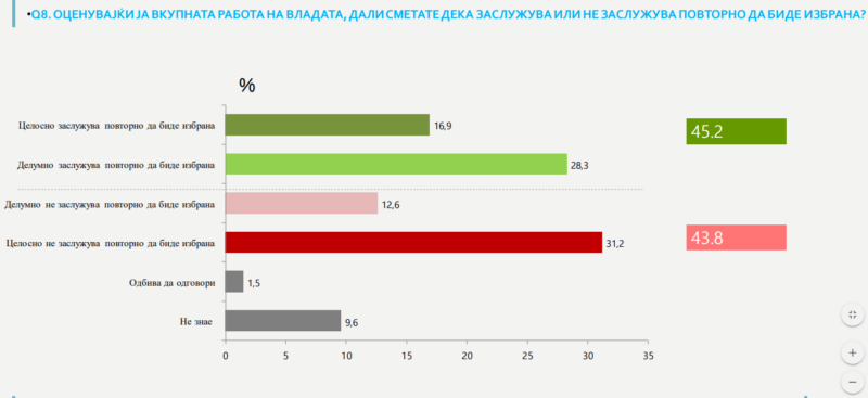 Испитаниците биле и прашани дали сметаат дека Владата заслужува повторно да биде избрана, на што 45,2 отсто дале целосна или делумна поддршка, додека 43,8 проценти не сметаат дека Владата треба да биде реизбрана.