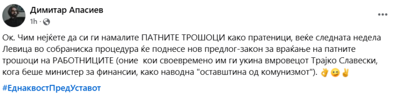 „Ок. Чим нејќете да си ги намалите патните трошоци како пратеници, веќе следната недела Левица во собраниска процедура ќе поднесе нов предлог-закон за враќање на патните трошоци на работниците (оние кои своевремено им ги укина вмровецот Трајко Славески, кога беше министер за финансии, како наводна ‘оставштина од комунизмот’)“, напиша Апасиев.