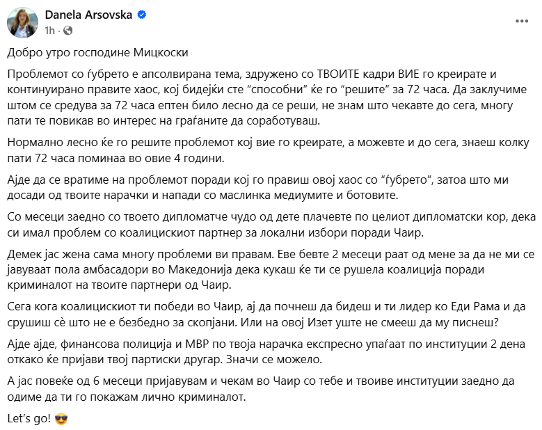 „Проблемот со ѓубрето е апсолвирана тема, здружено со ТВОИТЕ кадри ВИЕ го креирате и континуирано правите хаос, кој бидејќи сте “способни” ќе го “решите” за 72 часа. Да заклучиме штом се средува за 72 часа ептен било лесно да се реши, не знам што чекавте до сега, многу пати те повикав во интерес на граѓаните да соработуваш“, пишува Арсовска.