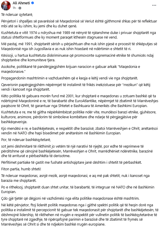 Оваа годишнина, ги поканувам македонските политички лидери од целиот политички спектар да ја напуштат политиката на инсталирање на погрешна перцепција кај Македонците за Албанците и соживотот, да демонстрираат лидерство, да се вратат на патот на почитувањето на политичката волја на нивните сограѓани Албанци на избори, да се залагаат за еднаквост и спроведување на духот на Охридскиот договор и заедно да го следиме европскиот пат“, напиша Ахмети.