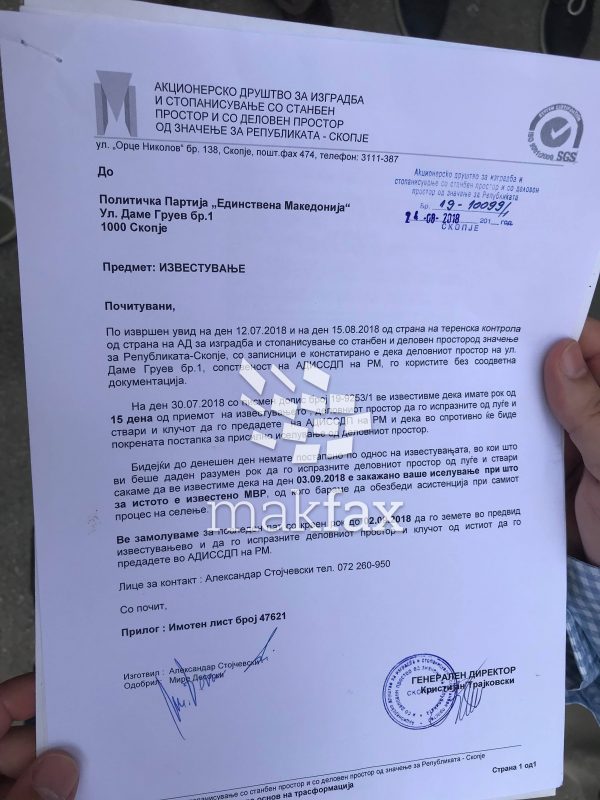 „Во централниот регистар партијата е регистрирана на Даме Груев бр 10. Незаконски нè отстрануваат бидејќи тие пратиле известување за наше иселување од зграда број 1. Зградата 22 години е во сопственост на Центро, па дури сега во 2018 година со неа стопанисува владиното претпријатие за станбен и деловен простор, со што се дава простор дека станува збор за фaлсификувани документи“, вели Бачев.