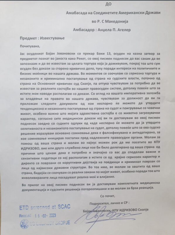 Осудениот Бојан Јовановски-Боки 13 за тврдењата дека е цел на тортура, за наводите дека има криминално постапување од страна на Кривичниот суд, но и дека располага со сензитивни податоци за криминал што го правеле највисоките државни структури, ги известил Амбасадата на САД и амбасадорката Анџела Агелер. Неговиот адвокатски тим копија од писмото испрати и во јавноста, каде што наведува дека се бара од Амбасадата и од амбасадорката да го посетат Јовановски-Боки 13 во затворот.