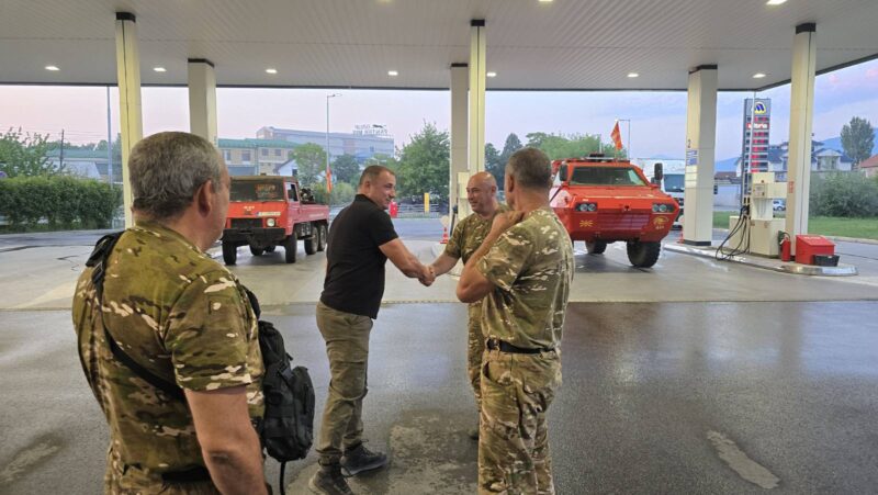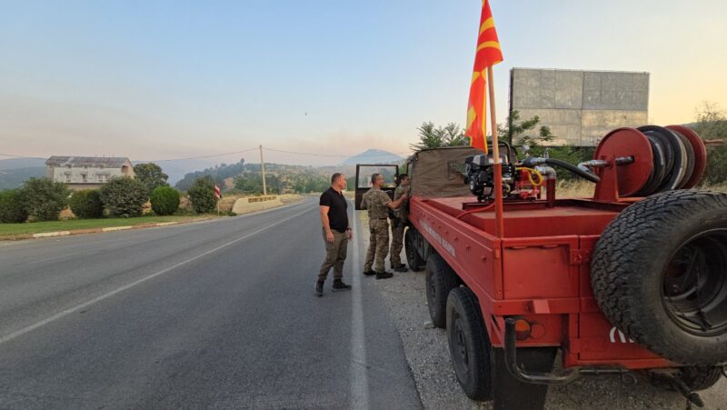 Два полициски хеликоптера, еден армиски хеликоптер, еден Хермелин со цистерна на ДЗС, еден Пинцгауер на ДЗС и едно теренско возило „амарок” на ДЗС, дејствуваат како поддршка на скопската Бригада за противпожарна заштита која со повеќе пожарникари и возила го гаси големиот пожар на отворен простор на територијата на општина Чучер Сандево над магистралниот пат Скопје – Блаце кој изби вчера во попладневните часови.