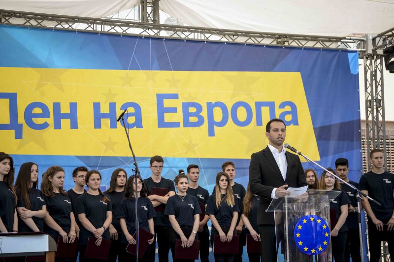 Амбасадорот на ЕУ во Р.Македонија, Самуел Жбогар, кој се обрати на македонски јазик истакна дека славењето на овој 9 мај Денот на Европа е посебен, бидејќи се слави во знакот на пресвртницата, која се случи во Македонија, а која што како што рече од земја, која назадува стана земја, која се движи кон вистинскиот правец.
