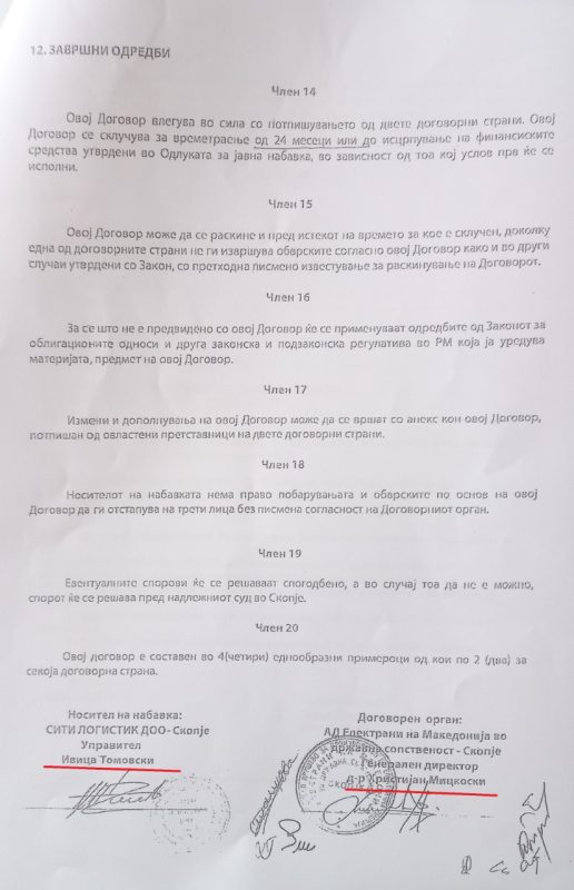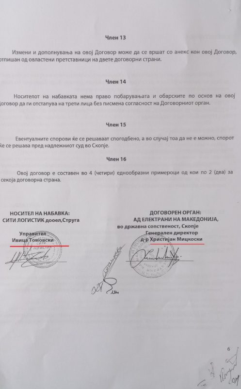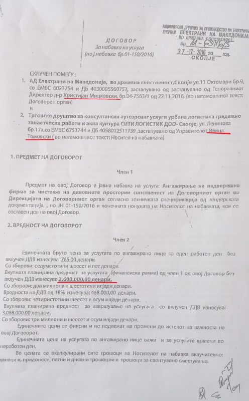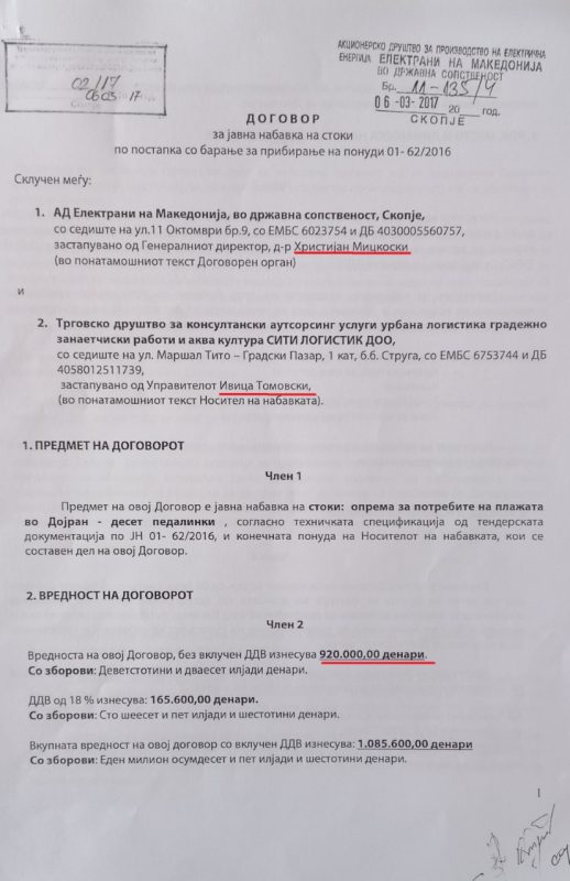 Тој го објави Договорот, вреден 2 милиони и 600 илјади денари или 42.000 евра, во име на Сити Логистик е потпишан како управител Томовски, а по него и Договорот за уште еден тендер вреден околу 1 милион денари или 16.000 евра.