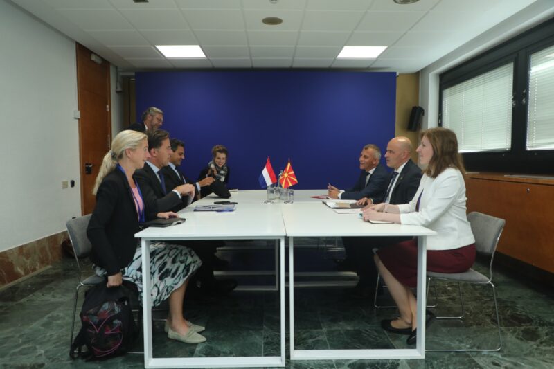 Двајцата премиери разменија мислења околу евроинтеграциите на Северна Македонија, објективниот пристап на Холандија во оценувањето на критериумите за пристапување на нашата држава во Унијата создава дополнителен импулс за Северна Македонија во давање резултати и ја потврдува посветеноста на Владата на реформската агенда на земјата за побрзо членство на Северна Македонија во Европската Унија, се додава во соопштението на прес-службата на Владата.