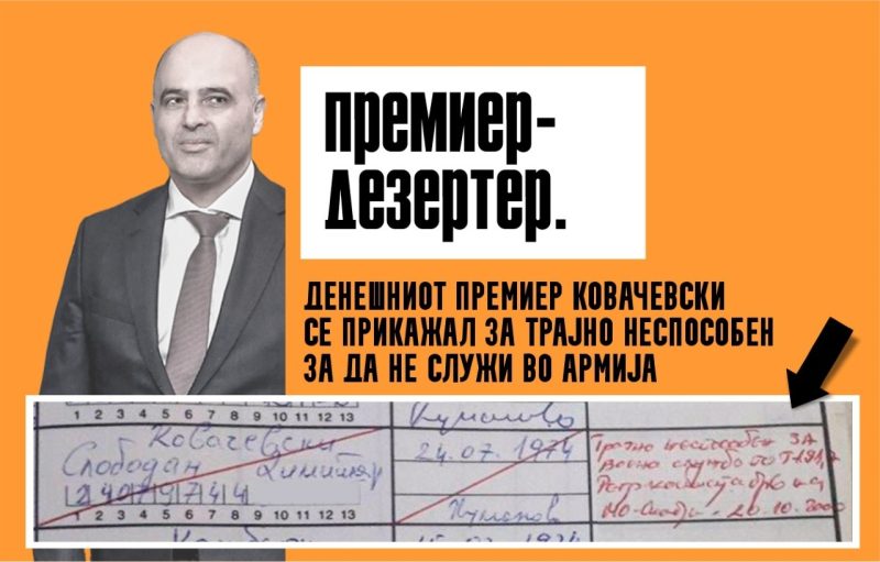 „Димитар Ковачевски, премиер на Македонија, го избегнал отслужувањето на воениот рок правдајќи се со лекарско мислење дека е ТРАЈНО НЕСПОСОБЕН за служење војска. Ова е документот, извадок од евиденциската книга на АРМ, објавен на социјалните мрежи. Од овој документ јасно се гледа дека Ковачевски од страна на лекари е прогласен за ТРАЈНО НЕСПОСОБЕН“, рече на денешната прес-конференција Драган Ковачки, пратеник и член на ИК на ВМРО-ДПМНЕ.