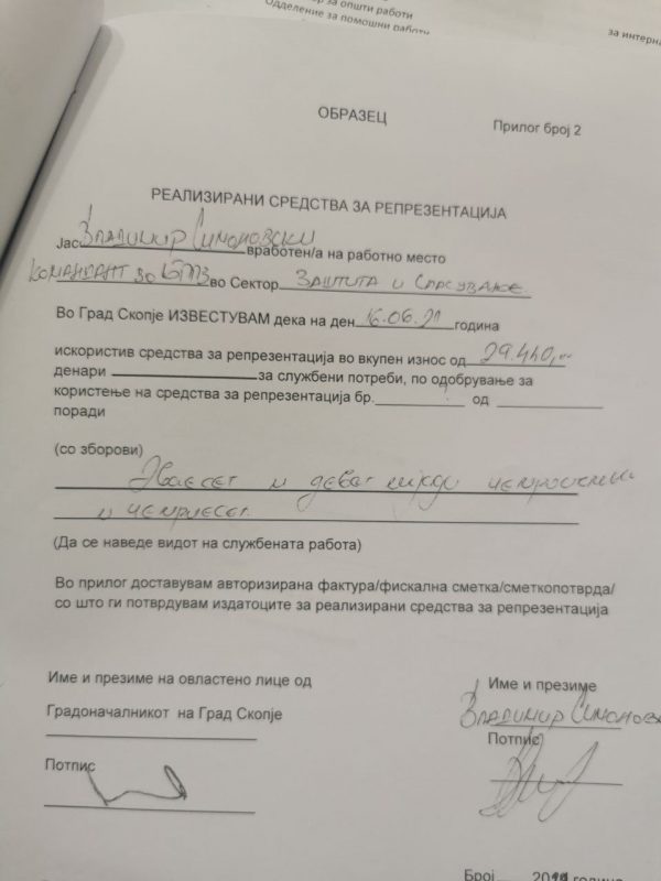 Според наведеното во барањето за одобрување средства за репрезентација, лицето Владимир Симоновски, командант на противпожарната бригада, навел дека репрезентациите се искористени за гости од странство при промоција на скалата возило“, наведе Митева и потсети дека на социјалните мрежи се ширеле шпекулации оти во кризните моменти кога Македонија ја зафатија пожари на одмор бил и командирот на скопската противпожарна бригада.