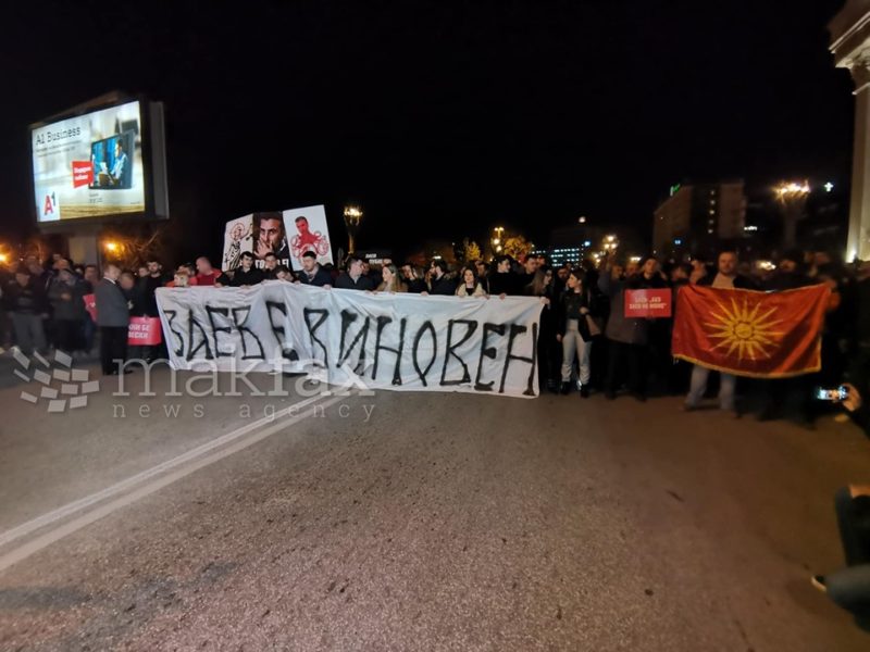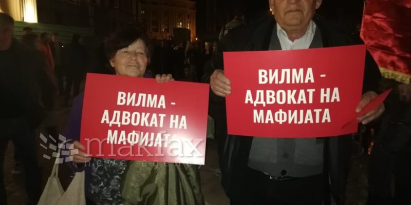 Насобраните на чело носат транспарент, на кој пишува „Заев е виновен“, а има и транспаренти што се однесуваат на шефицата на Обвинителството против организиран криминал и корупција, Вилма Русковска.