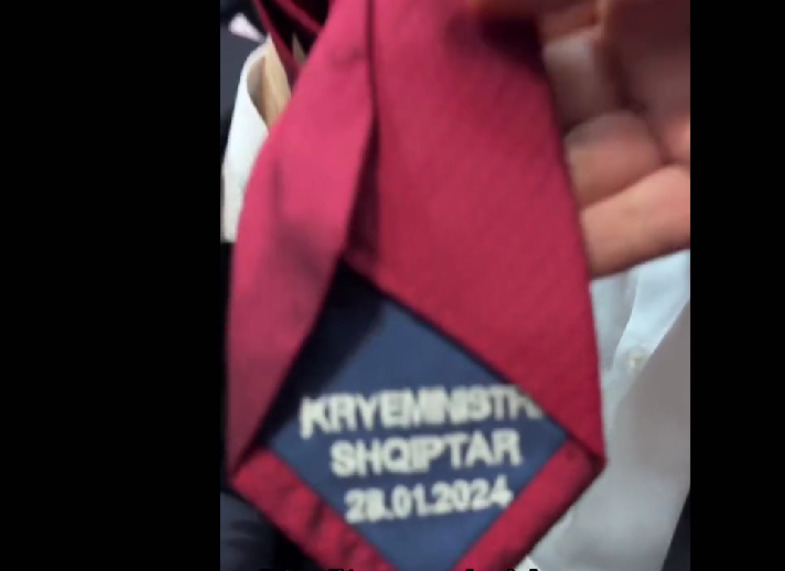 На видеата, лидерот на ДУИ, Али Ахмети, и другите членови ги покажуваат црвените вратоврски на кои од внатрешната страна пишува „Премиер Албанец“ и наведен е датумот за кој велат дека е историски за Албанците во земјата.