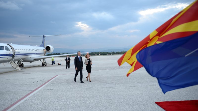 На Меѓународниот аеродром Скопје, генералниот секретар беше пречекан од министерката за одбрана, Радмила Шекеринска.
