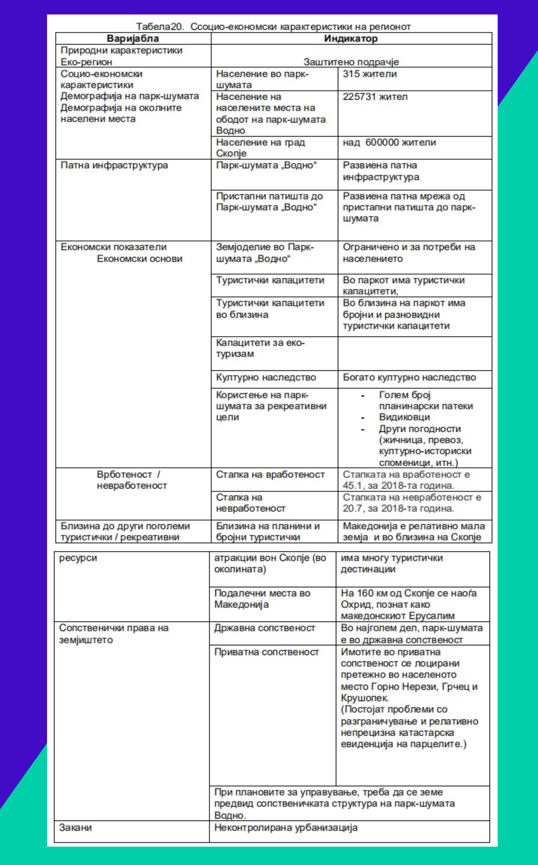 „Според добиените податоци од Агенцијата за катастар на недвижности, од 39,4 km2 или 3943.3 хектари во предложената граница-опфат, 25,83 km2 или 65,23% е државно земјиште, а 13,76 km2 или 34.77% е приватно земјиште. Овие податоци треба да се земат со одредена резерва, со оглед на тоа што мал дел од земјиштето, според катастарската евиденција има непознат сопственик или е ‘неизложено’. Како и да е, во структурата јасно доминира државното земјиште, особено во повисоките делови над 700 m надморска