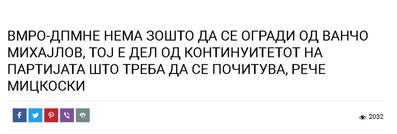 Почесниот претседател на ВМРО-ДПМНЕ и осуден криминалец во бегство, Никола Груевски, го потврди континуитетот со Ванчо Михајлов. Исто како и Христијан Мицкоски, кој јавно кажа дека нема да се огради од Ванчо Михајлов затоа што е дел од континуитетот на оваа партија. Тоа е истата матрица на ВМРО-ДПМНЕ, која се пресликува и овде во законодавниот дом, изјави пратеникот на СДСМ, Миле Талески.