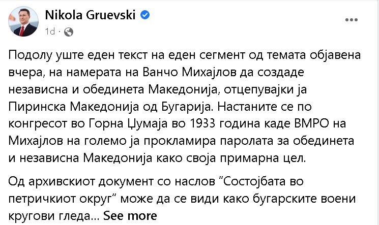 Ете бугаризацијата во оваа држава што ја прави ВМРО-ДПМНЕ и ВМРО – БНД со заеднички именител, нивниот претседател Ванчо Михајлов. Токму ВМРО-ДПМНЕ во чест на Ванчо Михајлов изгради спомен-куќа во Штип и постави восочна фигура во природна големина во Музејот во Скопје. ВМРО-ДПМНЕ и ВМРО-БНД се лонче и капаче“, рече Талески.