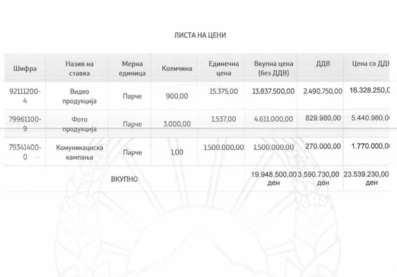„Додека во Македонија граѓаните едвај преживуваат, не можат да наполнат цела кошничка во маркет, Владата ќе фрла астрономски суми, 1.500 денари за една фотографија и над 15.000 денари за едно видео. Вкупно 380 илјади евра! Претходно Владата склучи договор вреден 400.000 евра за анкети за мерење на рејтигнот на Мицкоски. Анкети, спотови, слики – 780.000 евра народни пари за да се продава лажната слика“, вели Цветаноски.