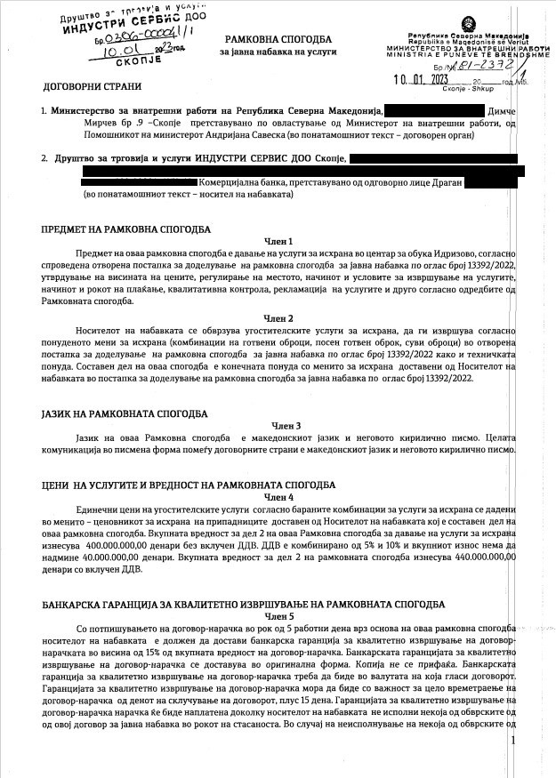 „Договорот е склучен помеѓу МВР на Оливер Спасовски и фирмата Индустри сервис, а со кој му се дава право на Министерството за внатрешни работи да потроши до 440 милиони денари, односно 7 милиони и 150 илјади евра за исхрана. Се работи за бонбона бизнис со оглед дека само во Центарот за обука на дневна основа ќе се дистрибуираат нешто помалку од 1.000 оброци“ рече Чулев.