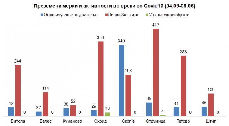 Исто така, полицијата во соработка со Државниот пазарен инспекторат учествуваше во вкупно 1.543 контроли во угостителски објекти, при што констатирани се вкупно 22 непочитувања: 18 на територијата на СВР Охрид и 4 при СВР Струмица. Истовремено, како што потенцира министерот Чулев, во посочениот период издадени се вкупно 1.648 решенија за изолација и потпишани се 584 изјави за самоизолација, а МВР извршило вкупно 8.701 контрола по основ на самоизолација и изолација.