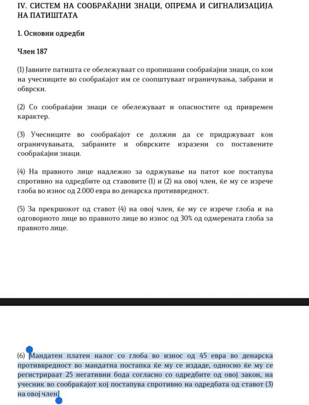 Таа одредба гласи: Мандатен платен налог со глоба во износ од 45 евра во денарска противвредност во мандатна постапка ќе му се издаде, односно ќе му се регистрираат 25 негативни бода согласно со одредбите на овој закон, на учесник во сообраќајот кој постапува спротивно на одредбата од ставот (3) на овој член.